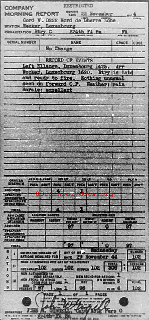 Left Ellange, Luxembourg 1425. Arr Wecker, Luxembourg 1620. Btry is laid and ready to fire. Nothing unusual seen on forward O.P. Weather: Rain. Morale: Excellent.