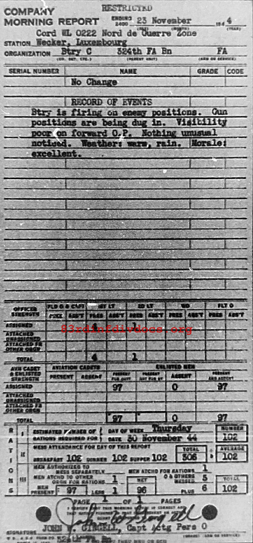 Btry is fired on enemy positions. Gun positions are being dug in. Visibility poor on forward O.P. Nothing unusual noticed. Weather: Warm, rain. Morale: Excellent.