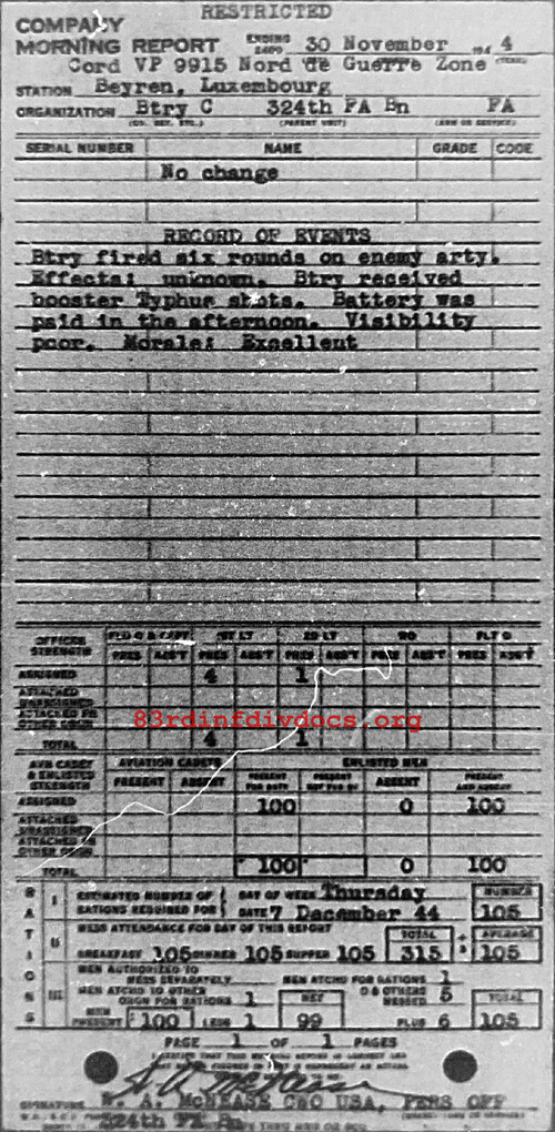Btry fired six rounds on enemy arty. Effects: unknown. Btry received booster Typhus shots. Battery was paid this afternoon. Visibility poor. Morale: Excellent.