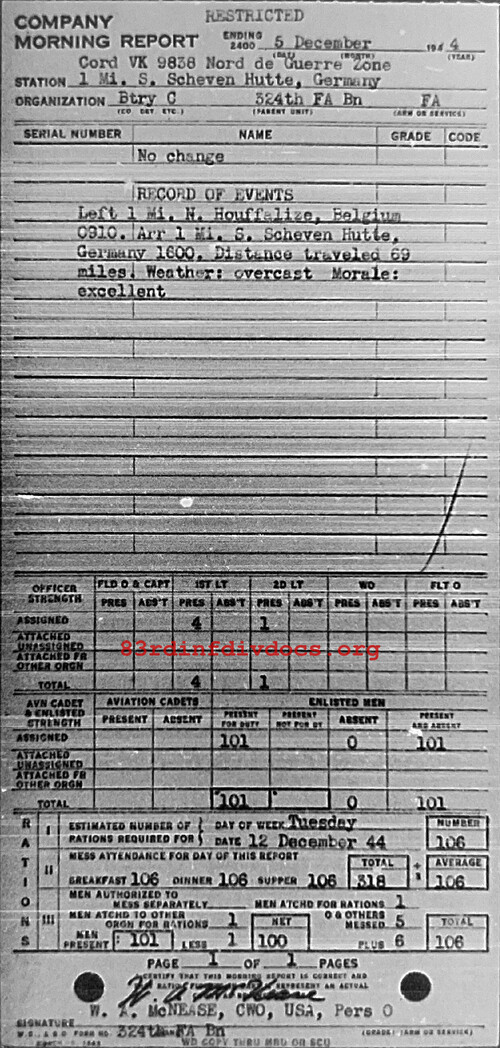 Left 1 Mi. N. Houffalize, Belgium 0910. Arr 1 Mi. S. Scheven Hutte, Germany 1600. Distance traveled 69 miles. Weather: Overcast. Morale: Excellent.
