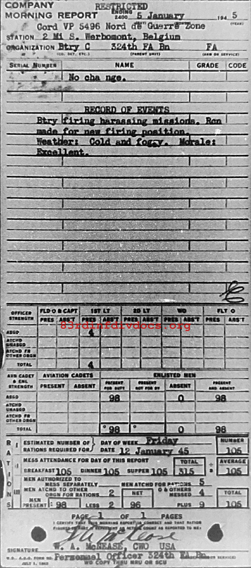 Btry firing harassing missions. Rcn made for new firing position. Weather: Cold and foggy. Morale: Excellent.
