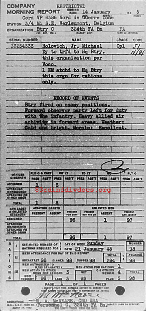 Btry fired on enemy positions. Forward observer party left for duty with the infantry. Heavy allied air activity in forward area. Weather: Cold and bright. Morale: Excellent.