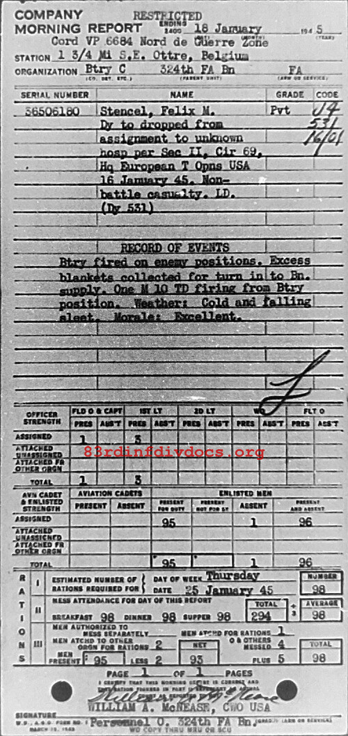 Btry fired on enemy positions. Excess blankets collected for turn in to Bn. supply. One M 10 TD firing from Btry position. Weather: Cold and falling sleet. Morale: Excellent.