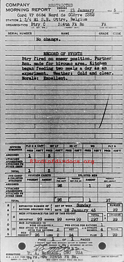 Btry fired on enemy position. Further rcn. made for bivouac area. Kitchen began feeding two meals a day as an experiment. Weather: Cold and clear. Morale: Excellent.