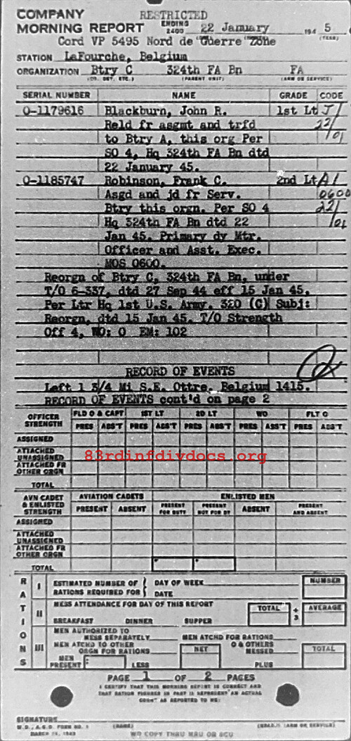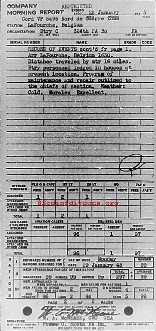 Morning report C/324FA for January 22, 1945