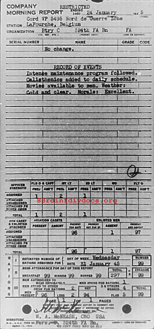 Intense maintenance program followed. Calisthenics added to daily schedule. Movies available to men. Weather: Cold and clear. Morale: Excellent.