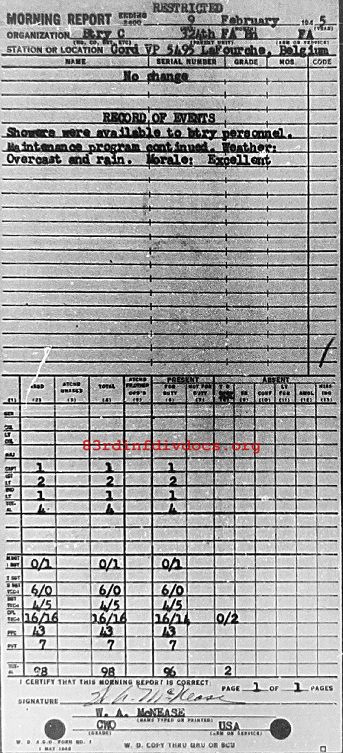 Showers were available to btry personnel. Maintenance program continued. Weather: Overcast and rain. Morale: Excellent.