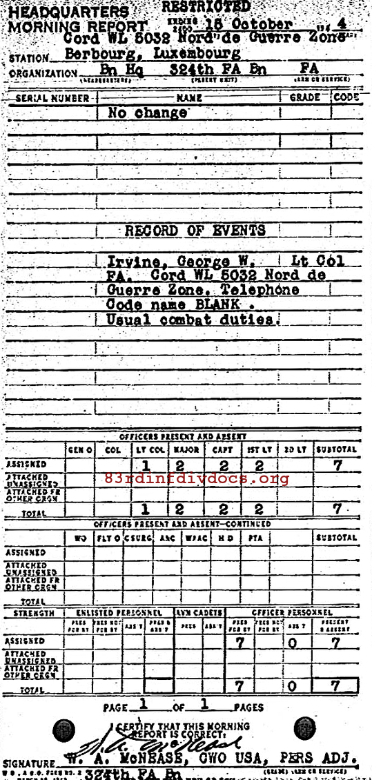 Irvine, George W. Lt Col FA. Cord WL5032. Telephone code name Blank. Usual combat duties.