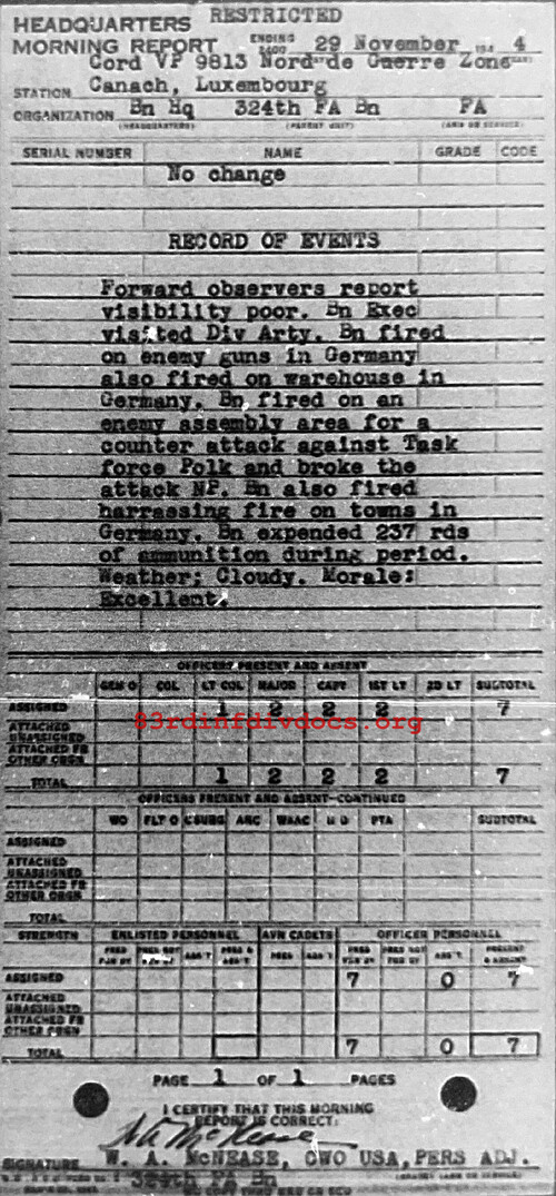 Forward observers report visibility poor. Bn Exec visited Div Arty. Bn fired on enemy guns in Germany also fired on warehouse in Germany. Bn fired on an enemy assembly area for a counter attack against Task Force Polk and broke the attack NP. Bn also fired harassing fire on towns in Germany. Bn expended 237 rds of ammunition during period. Weather: Cloudy. Morale: Excellent.