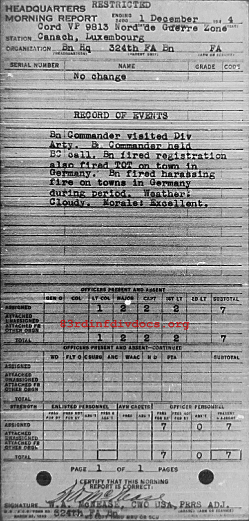 Bn Commander visited Div Arty. Bn Commander held BC call. Bn fired registration also fired TOT on town in Germany. Bn fired harassing fire on towns in Germany during period. Weather: Cloudy. Morale: Excellent.