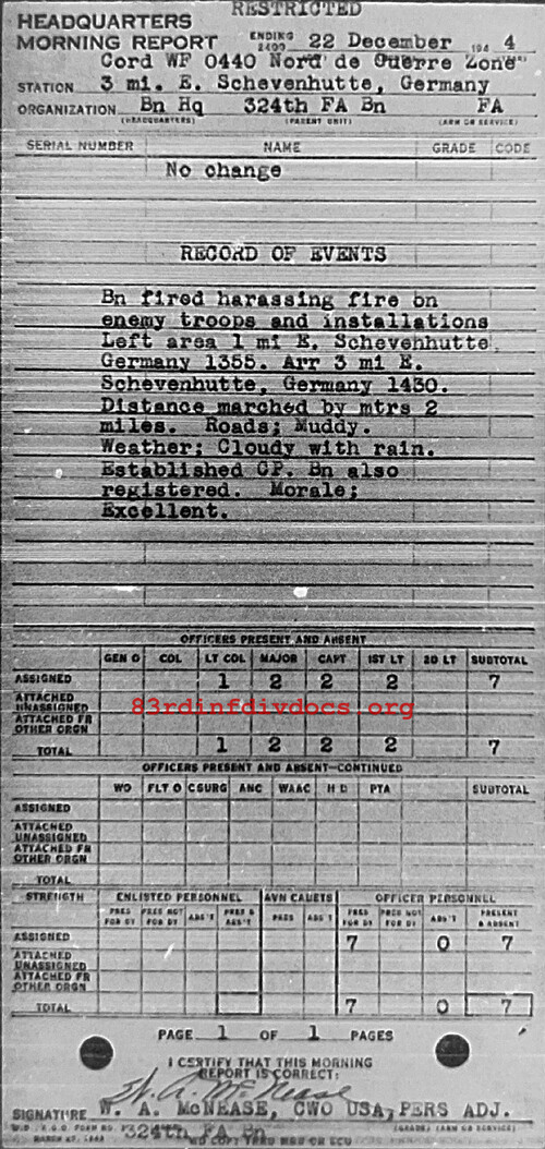 Bn fired harassing fire on enemy troops and installations. Left arae 1 mi E. Schevenhutte, Germany 1355. Arr 3 mi E. Schevenhutte, Germany 1430. Distance marched by mtrs 2 miles. Roads: Muddy. Weather: Cloudy with rain. Established CP. Bn also registered. Morale: Excellent.