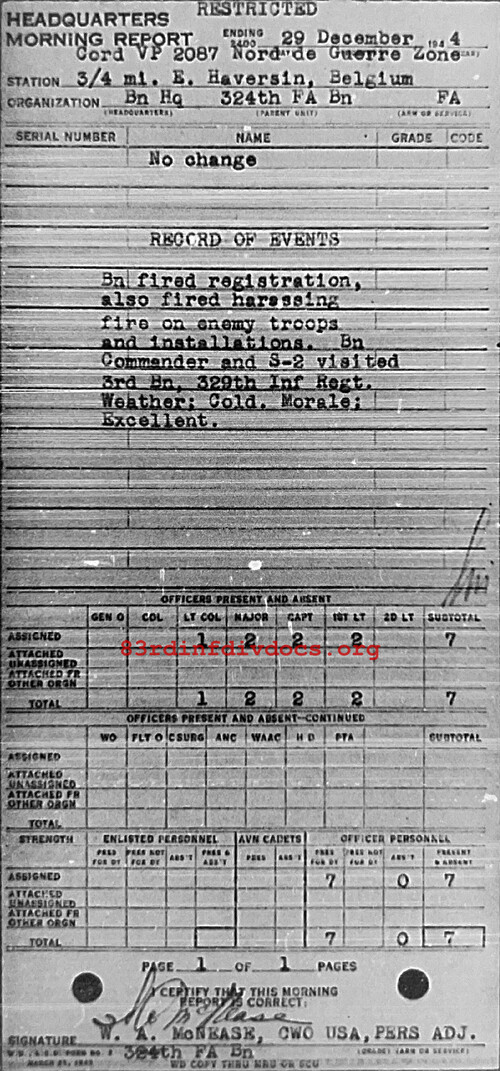 Bn fired registration also fired harassing fire on enemy troops and installations. Bn Commander and S-2 visited 3rd Bn, 329th Inf Regt. Weather: Cold. Morale: Excellent.