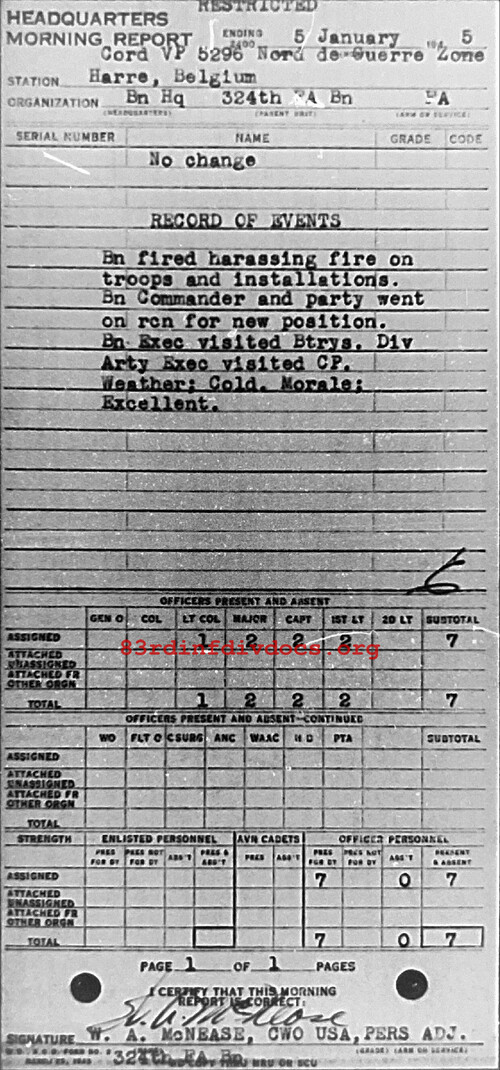Bn fired harassing fire on troops and installations. Bn Commander and party went on rcn for new position. Bn Exec visited Btrys. Div Arty Exec visited CP. Weather: Cold. Morale: Excellent.