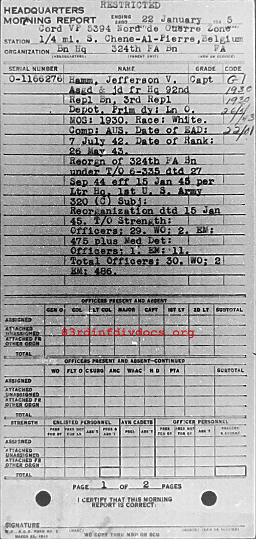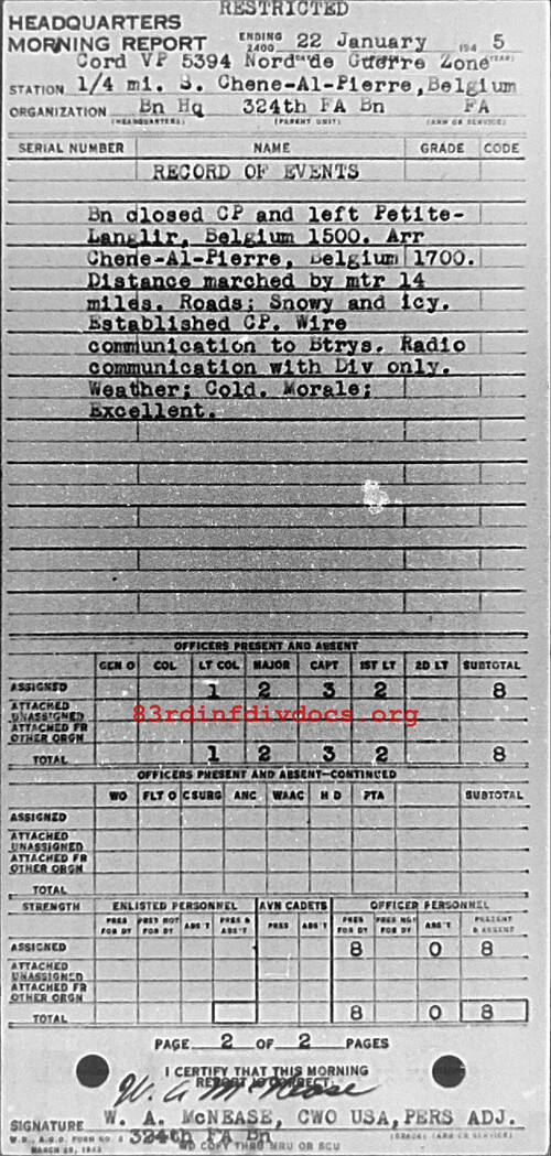 Bn closed CP and left Petite-Langlir, Belgium 1500. Arr Chene-Al-Pierre, Belgium 1700. Distance marched by mtr 14 miles. Roads: Snowy and icy. Established CP. Wire communication to Btrys. Radio communication with Div only. Weather: Cold. Morale: Excellent.