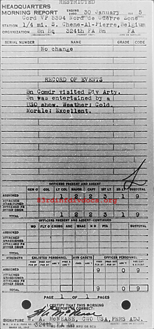 Bn Comdr visited Div Arty. Bn was entertained by a USO show. Weather: Cold. Morale: Excellent.