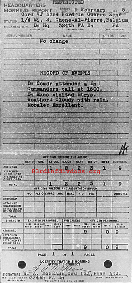 Morning report HQ/324FA for February 9, 1945