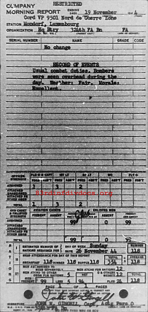 Usual combat duties. Bombers were seen overhead during the day. Weather: Fair. Morale: Excellent.