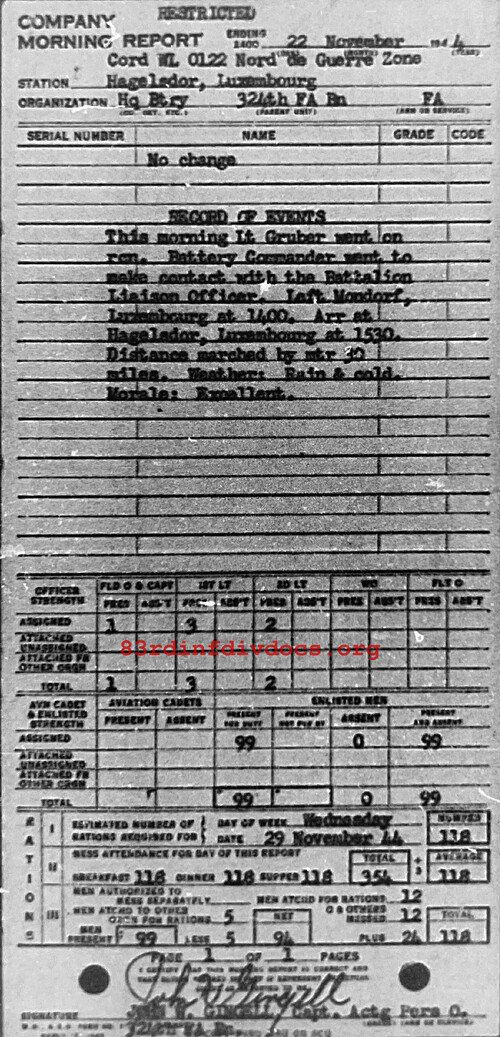 This morning Lt Gruber went on rcn. Battery Commander went on to make contact with the Battalion Liason Officer. Left Mondorf, Luxembourg at 1400. Arr at Hagelsdor, Luxembourg at 1530. Distance marched by mtr 30 miles. Weather: Rainy & cold. Morale: Excellent.
