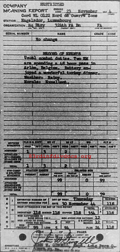 Usual combat duties. Two EM are spending a 48 hour pass in Arlon, Belgium. Battery enjoyed a wonderful turkey dinner. Weather: Rainy. Morale: Excellent.