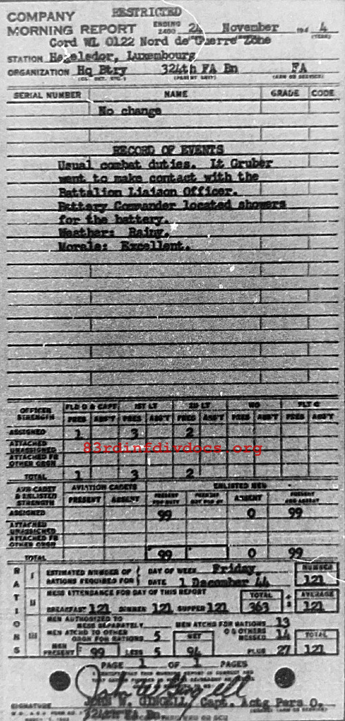 Usual combat duties. Lt Gruber went to make contact with the Battalion Liason Officer. Battery Commander located showers for the battery. Weather: Rainy. Morale: Excellent.