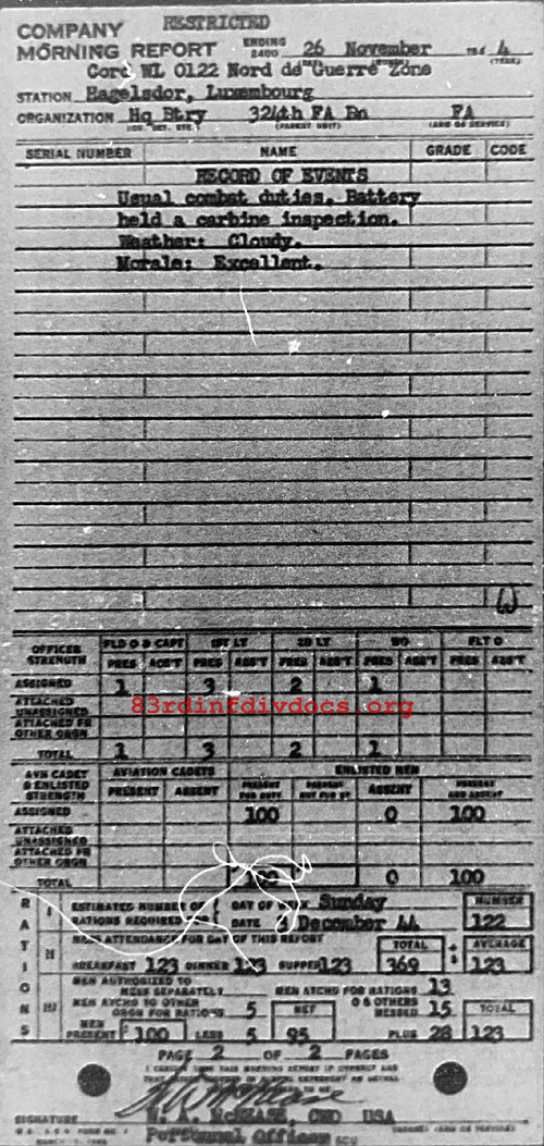 Usual combat duties. Battery held a carbine inspection. Weather: Cloudy. Morale: Excellent.
