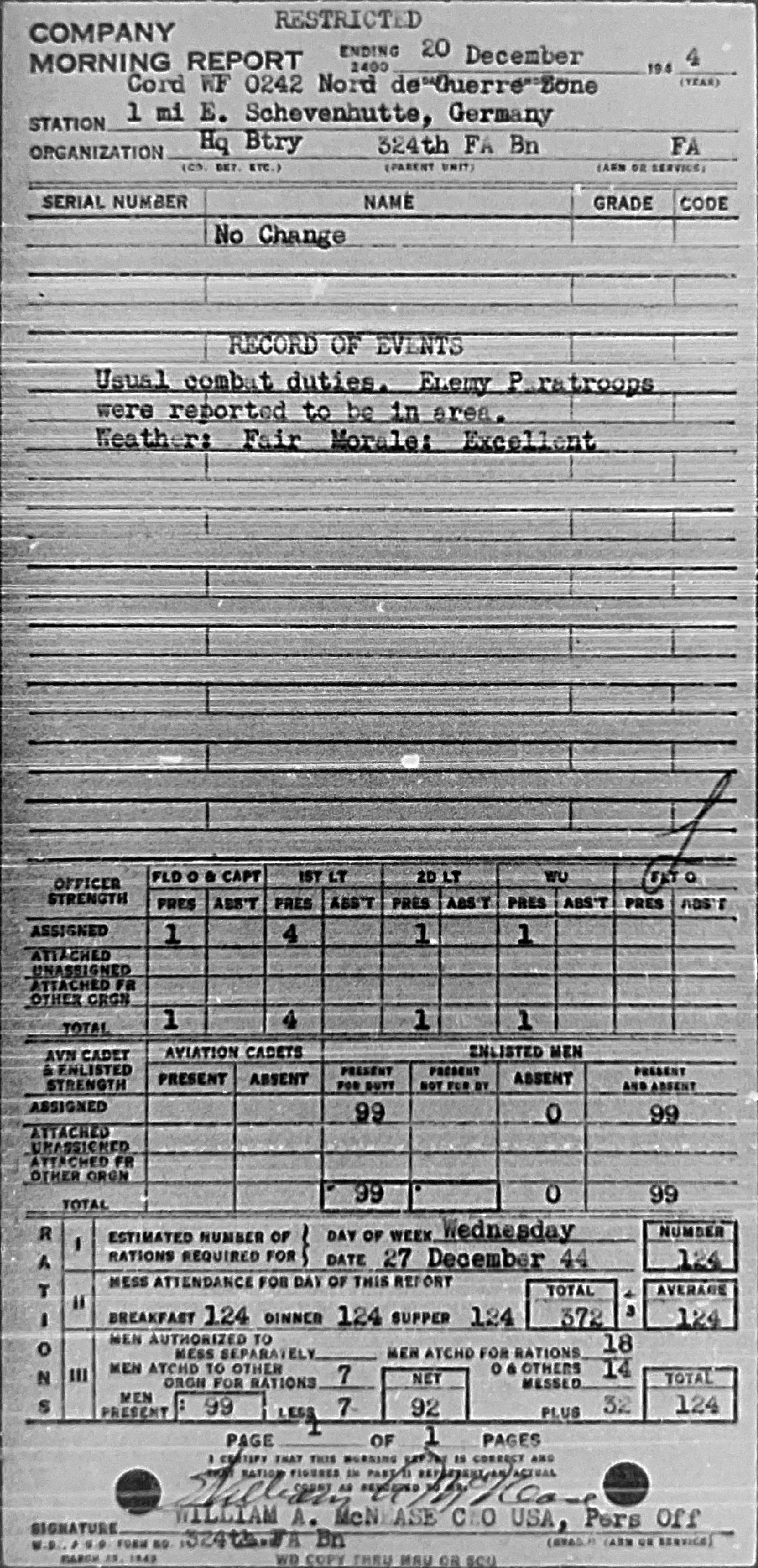 Morning report HQBTRY/324FA for December 20, 1944