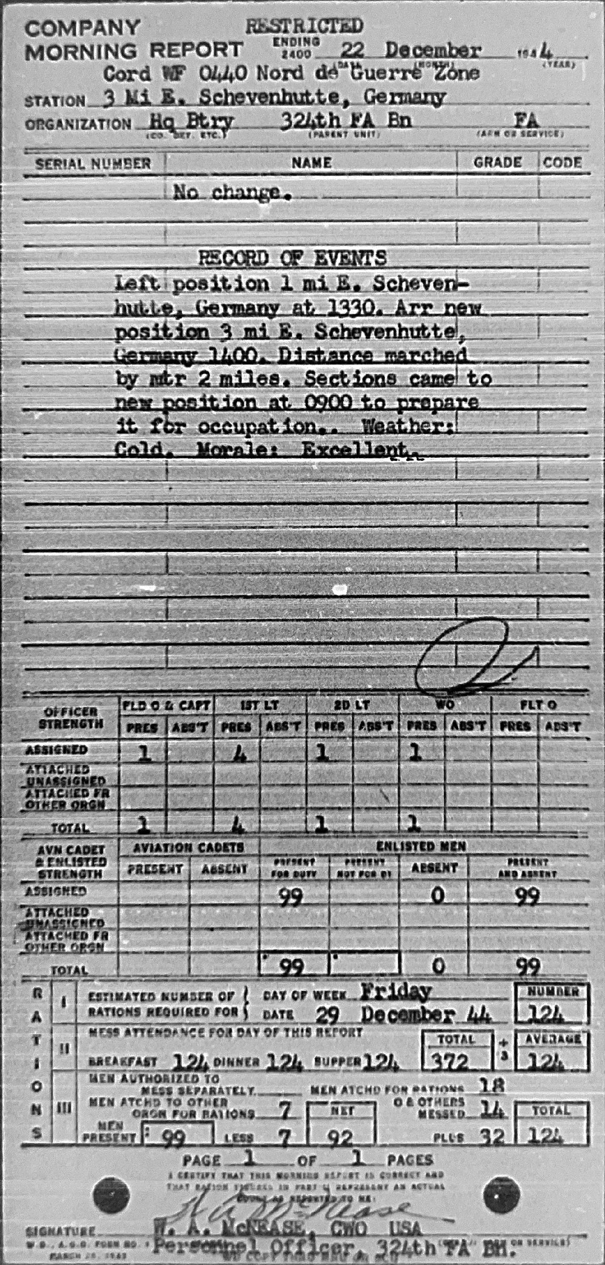 Left position 1 mi E. Schevenhutte, Germany at 1330. Arr new position 3 mi E. Schevenhutte, Germany 1400. Distance marched by mtr 2 miles. Sections came to new position at 0900 to prepare it for occupation. Weather: Cold. Morale: Excellent.