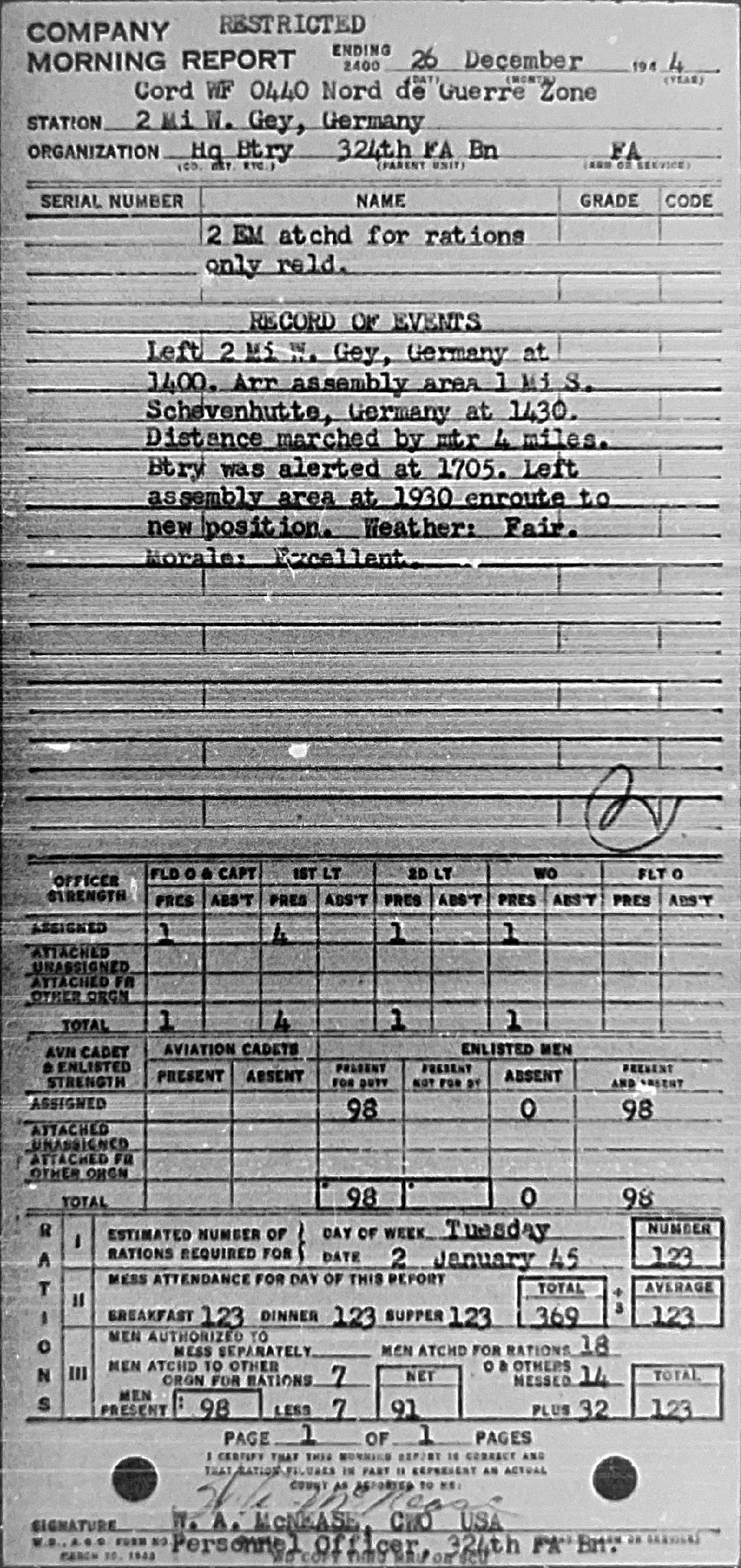 Morning report HQBTRY/324FA for December 26, 1944