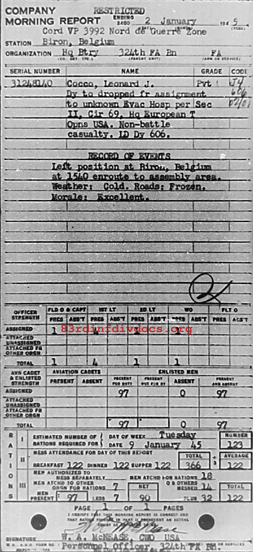 Left position at Birou, Belgium at 1540 enroute to assembly area. Weather: Cold. Roads: Frozen. Morale: Excellent.