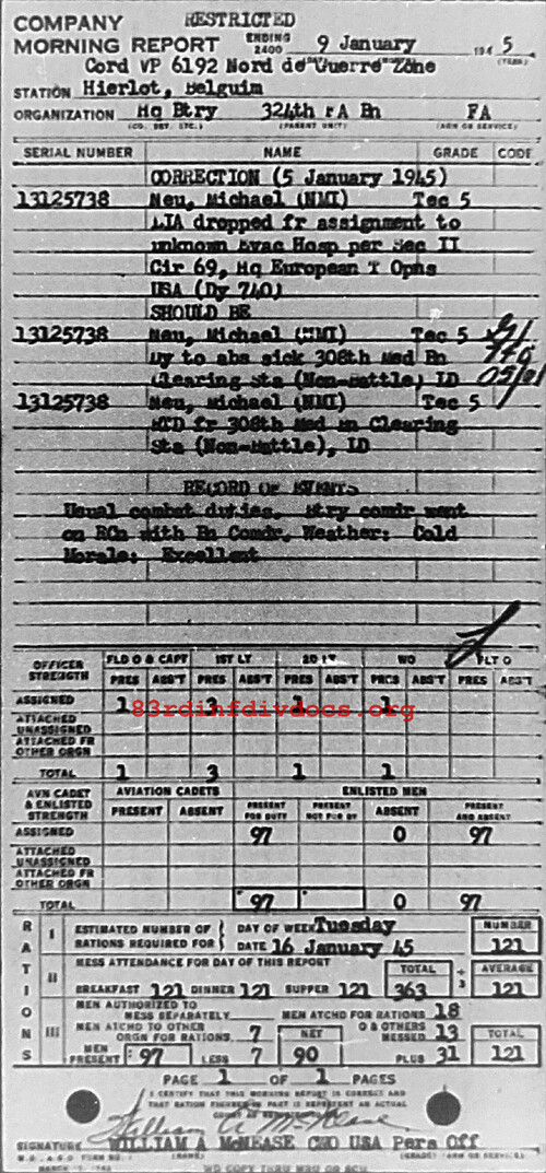 Morning report HQBTRY/324FA for January 9, 1945