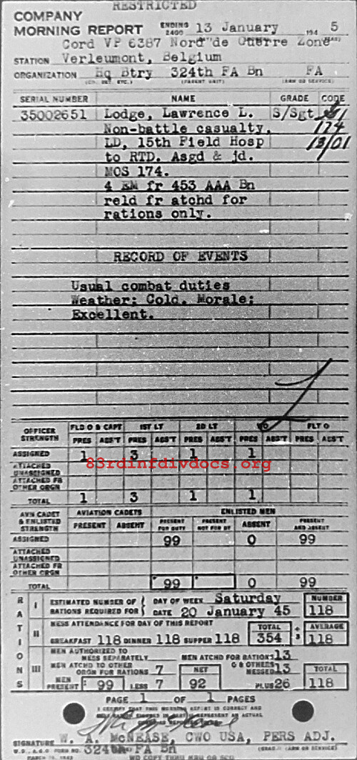 Morning report HQBTRY/324FA for January 13, 1945