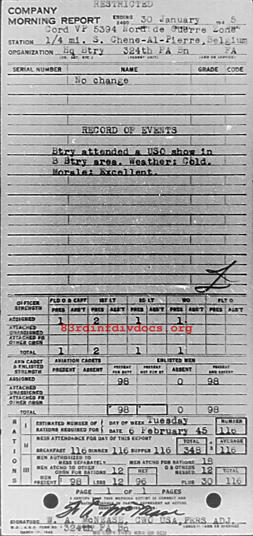 Btry attended a USO show in B Btry area. Weather: Cold. Morale: Excellent.