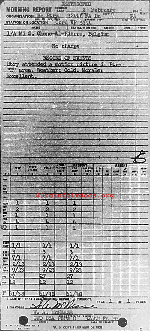 Btry attended a motion picture in Btry B area. Weather: Cold. Morale: Excellent.