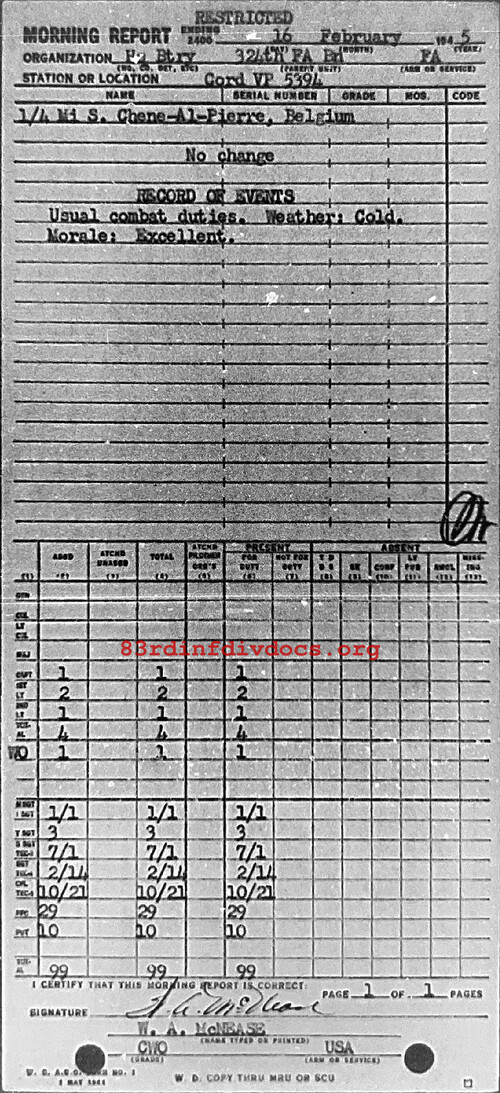 Morning report HQBTRY/324FA for February 16, 1945