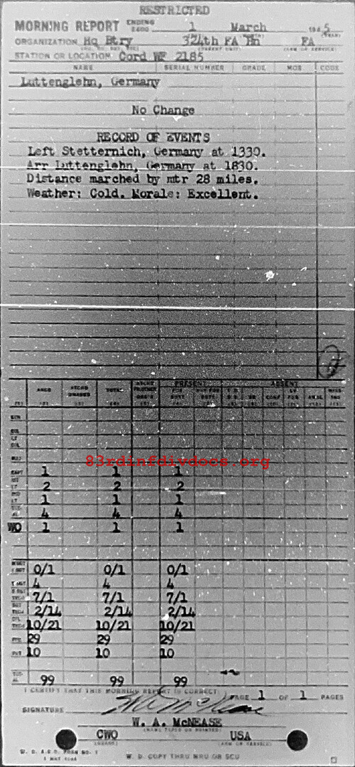 Morning report HQBTRY/324FA for March 1, 1945