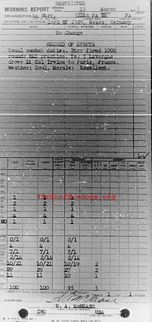 Morning report HQBTRY/324FA for March 15, 1945