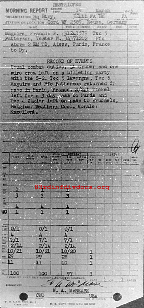 Morning report HQBTRY/324FA for March 19, 1945