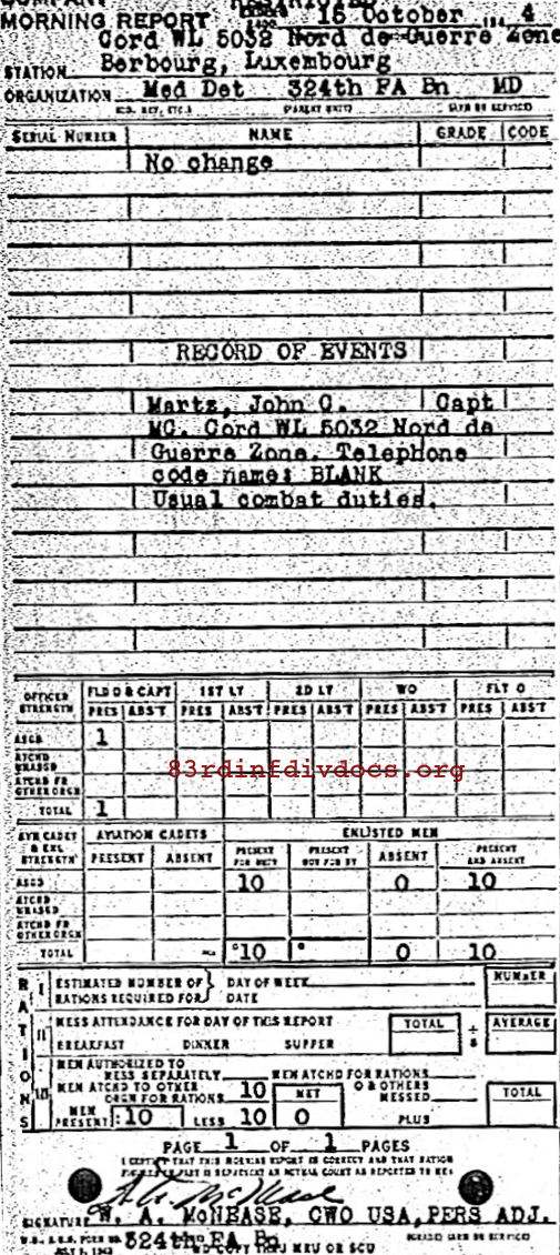 Martz, John, C Capt MC. Cord WL5032 NdG. Telephone code: Blank. Usual combat duties