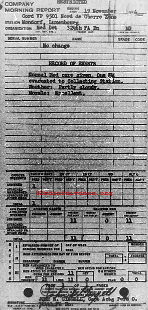 Normal Med care given. One EM evacuated to Collecting Station. Weather: Partly cloudy. Morale: Excellent.