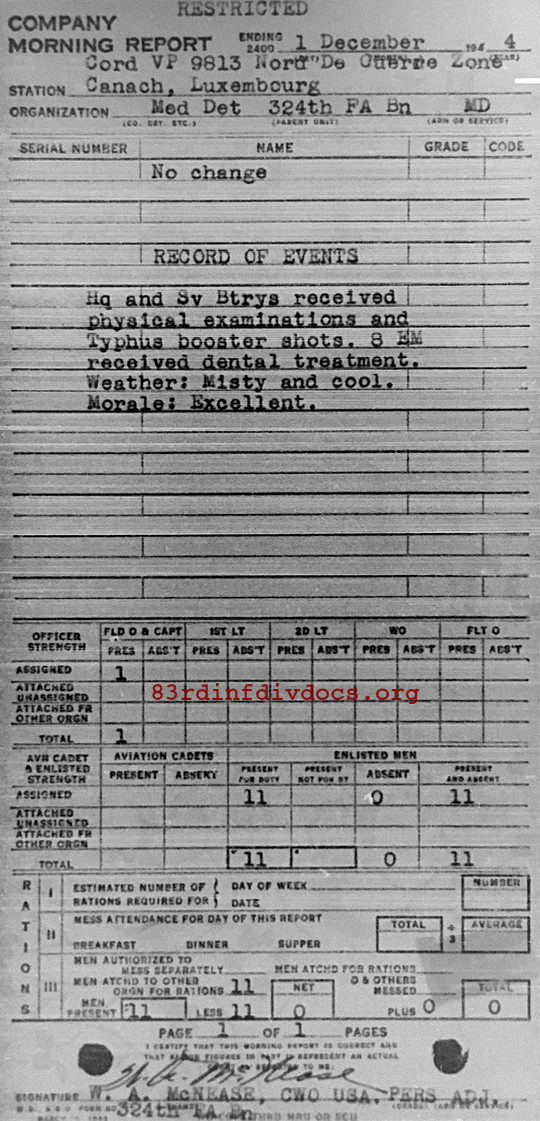Hq and Sv Btrys received physical examinations and Typhus booster shots. 8 EM received dental treatment. Weather: Misty and cool. Morale excellent.