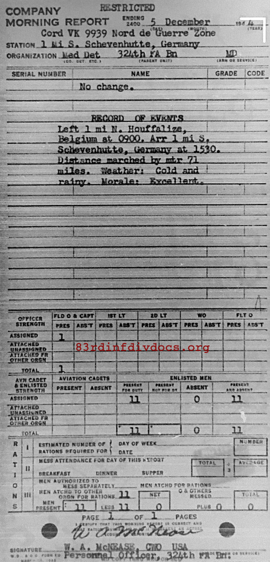 Left 1 mi N Houffalize, Belgium at 0900. Arr 1 mi S Schevenhutte, Germany at 1530. Distance marched by mtr 71 miles. Weather cold and rainy. Morale excellent.