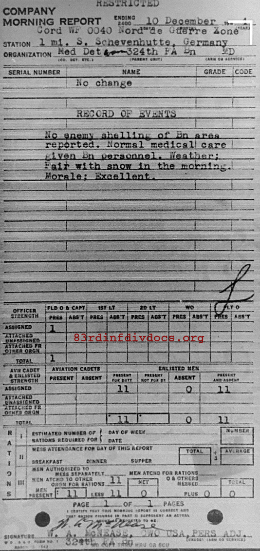 No enemy shelling of Bn area reported. Normal medical care given by Bn personnel. Weather fair with snow in the morning. Morale excellent.