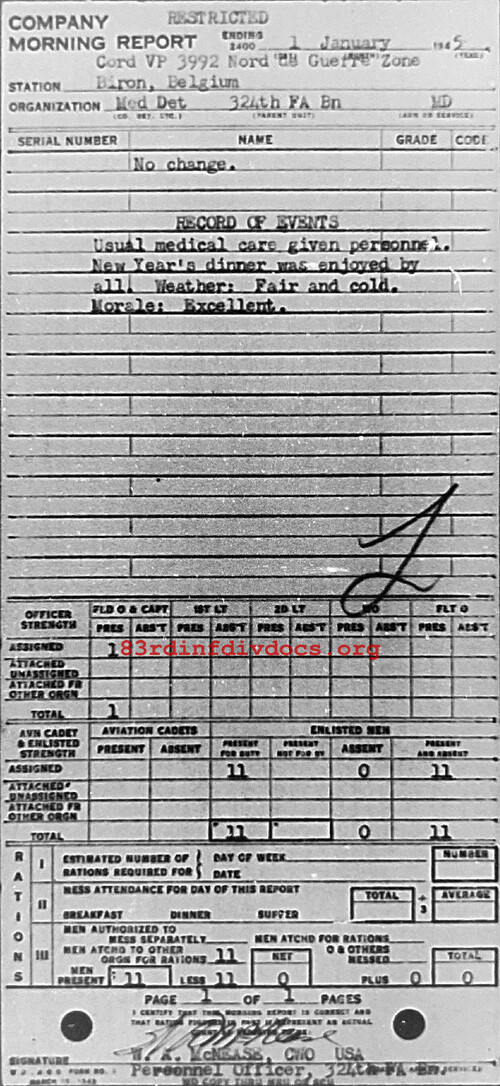 Usual medical care given by personnel. New Year's dinner was enjoyed by all. Weather: Fair and cold. Morale: Excellent.