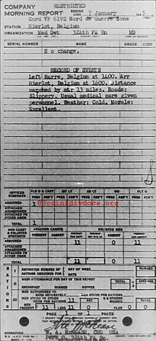 Left Harre, Belgium at 1400. Arr Hierlot, Belgium at 1600. Distance marched by mtr 13 miles. Roads: Slippery. Usual medical care given by personnel. Weather: Cold. Morale: Excellent.