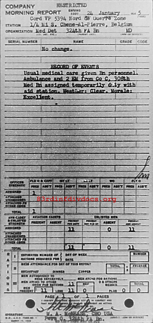 Usual medical care give Bn personnel. Ambulance and 2 EM from Co C, 308th Med Bn assigned temporarily duty with aid station. Weather: Clear. Morale: Excellent.