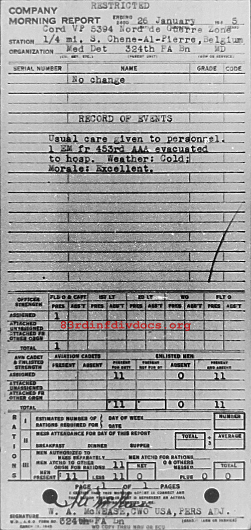 Usual care given to personnel. 1 EM fr 453rd AAA evacuated to hosp. Weather: Cold. Morale: Excellent.
