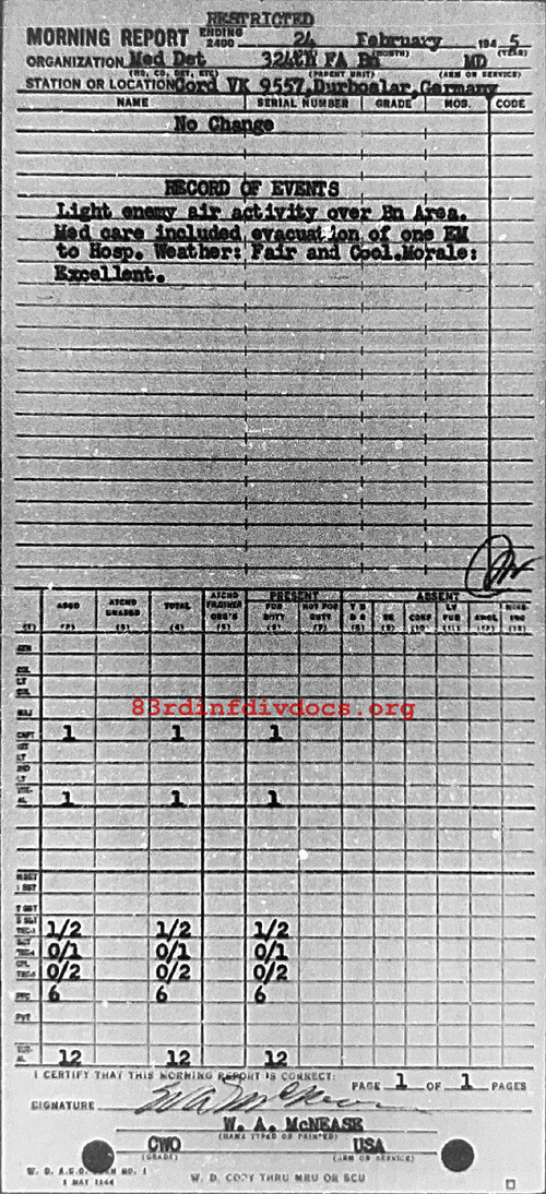 Light enemy air activity over Bn area. Med care included evacuation of EM to Hosp. Weather: Fair and cool. Morale: Excellent.