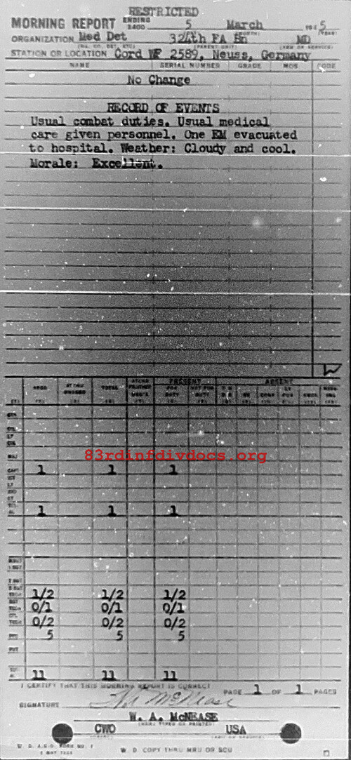 Usual combat duties. Usual medical care given personnel. One EM evacuated to hospital. Cloudy and cool. Morale: Excellent.
