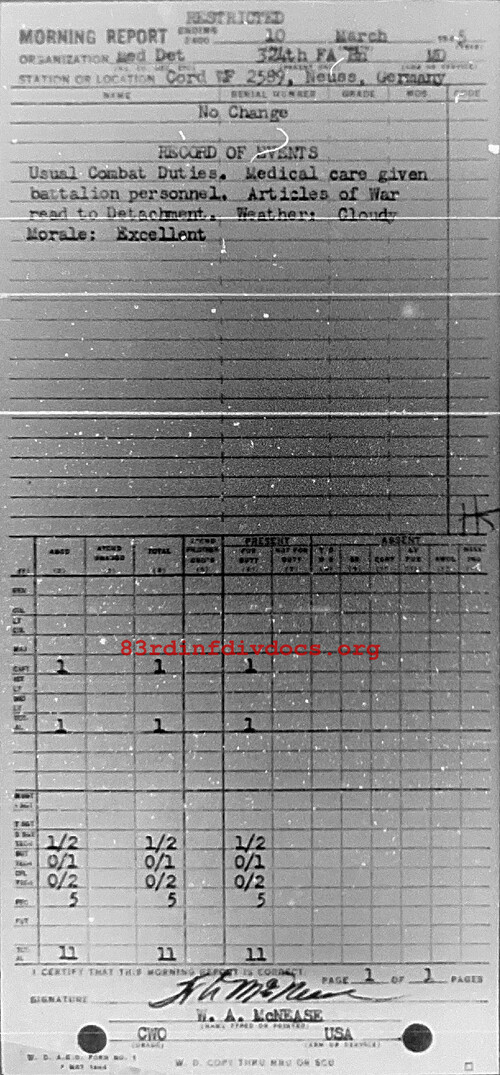 Usual Combat Duties. Medical care given battalion personnel. Articles of War read to Detachment. Weather: Cloudy. Morale: Excellent.