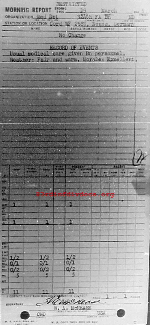 Usual medical care given Bn personnel. Weather: Fair and warm. Morale: Excellent.